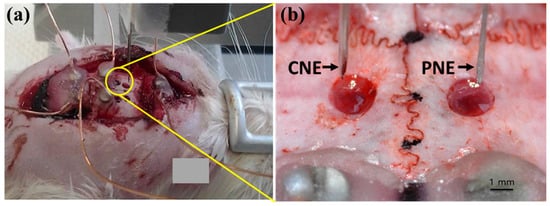(a) Rat being fixed in a stereotaxic apparatus mounted with a vertical micromanipulator, and (b) magnified image showing the region circled in yellow where holes are made on the skull in the diameter of approximately 2 mm with CNE and PNE stationed above (conventional neural electrodes, CNE).