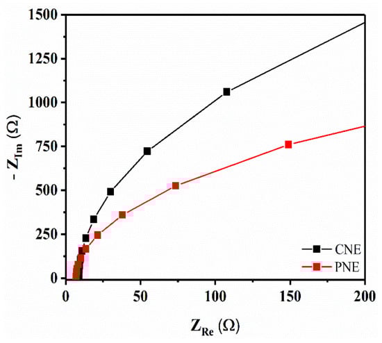 Fitted Nyquist plots from electrical impedance measurements of CNE and PNE (number of samples tested = one, N = 1; frequency 200 kHz–50 mHz and amplitude = 10 mV; measurements performed using saline electrolyte solution of 0.9 g NaCl in 100 mL deionized (DI) water).