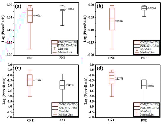 LFP was recorded from the cortices with CNE and PNE. Since LFPs are commonly measured at frequencies below 50 Hz [37,38], log power ratios of the measured 1 to 49 Hz signals were considered as the LFP signal. Between the electrodes, the measured 1 to 49 Hz signal intensities showed a significant difference (F (5,42) = 14, p < 0.001). The CNE signals showed significantly lower amplitudes than those from the PNE (p < 0.05), as seen in Figure 5a. Measured 1 to 49 Hz signals recorded at 1 mm depth showed a significant difference between CNE and PNE, with the CNE showing enhanced LFP signals (F (5,42) = 7.86, p < 0.001), as seen in Figure 5b.