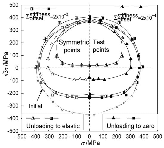 The shape of subsequent yield surface under reloading tends to be circular in stress space with the increase of the offset strain [15,17]. The subsequent yield surfaces of T2 pure copper under different offset strains [16] are shown in Figure 3. The results show that the anisotropy of the subsequent yield surfaces degrades gradually, and the subsequent yield surfaces approach a circle.
