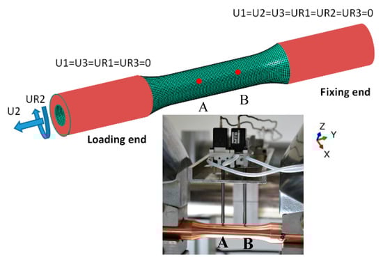 The deformation of a thin-walled circular tube specimen, which had a gauge length of 50 mm, a wall thickness of 1 mm, and an outer diameter of 16.5 mm, was simulated. The full-scale geometric model was established and divided into 64640 elements with 77952 nodes, as shown in Figure 4. Five elements were discretized along the direction of wall thickness during the gauge segment. The element type was C3D8R three-dimensional eight-node reduced integration element, which could avoid shear locking and improved the computational efficiency. The model was constrained and loaded by coupling the chuck elements (cf. the red region in Figure 4) with the displacement of the reference point, as shown in Figure 4. The first, third, fourth, and sixth degrees of freedom in the loading end were set to zero, and the axial and rotational displacements were performed on the second and fifth degrees of freedom to realize the combination loading of tension and torsion. All degrees of freedom at the fixed end were set to zero. Based on the finite element platform ABAQUS, the subroutine of user defined material (Umat) was applied to simulate the coupling behavior under tension-torsion loading.