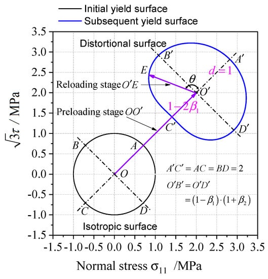 Because H is 1 and under preloading and unloading [given in Equation (16)], the plastic flow direction is orthogonal to the cylindrical yield surface during the two stages, i.e., . Similarly, and are established when anisotropy disappears in the process of reloading, i.e., . The yield surface evolves from anisotropy to quasi-isotropy gradually in the condition of under reloading, as displayed in Figure 3. Combining Equations (16), (20), and (22), the plastic flow direction can be expressed as: