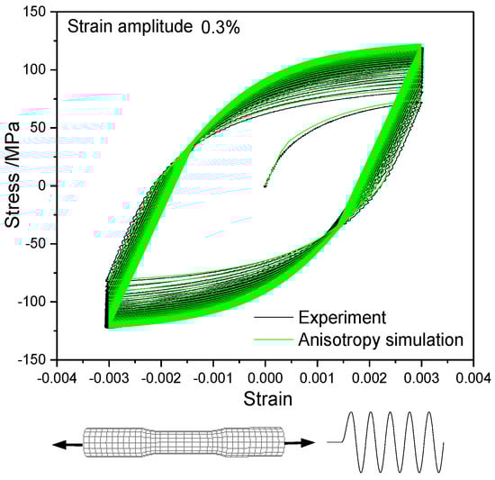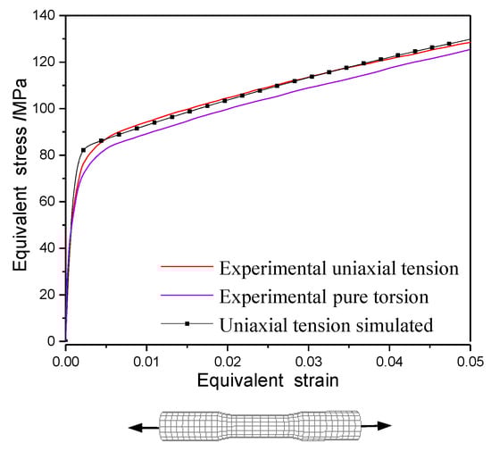 To validate the precision of the anisotropic plastic model, the simulated stress-strain curve of T2 pure copper under uniaxial tension and the hysteresis loop under uniaxial tension-compress with symmetric strain amplitudes were compared with the experimentally measured ones in Figure 8 and Figure 9, respectively. The results indicate that the macroscopic mechanical behaviors of the materials under monotonic loading and cyclic loading simulated by the anisotropic constitutive model were in good agreement with the experimental results. The equivalent stress-strain curves obtained by the uniaxial tensile test and the torsion test with thin-walled circular pipe specimen were different, as indicated in Figure 8. All model parameters in this paper were calibrated by the pre-tension test. The equivalent stress-strain curve simulated by the anisotropic plastic model was fully consistent with the experimental one under tension, but the equivalent stress-strain curve simulated by the anisotropic plastic model was slightly higher than the experimental data under torsion of thin-walled circular pipe specimen.