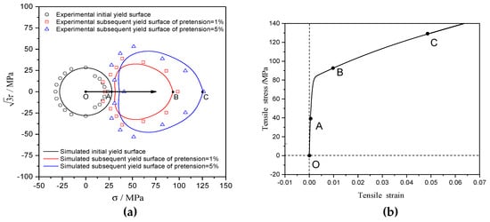 (a) The experimental yield surfaces with different pretension strains of 1% and 5% [34] versus the results simulated; (b) the stress-strain relationship corresponds to the path O-A-B-C.
