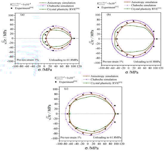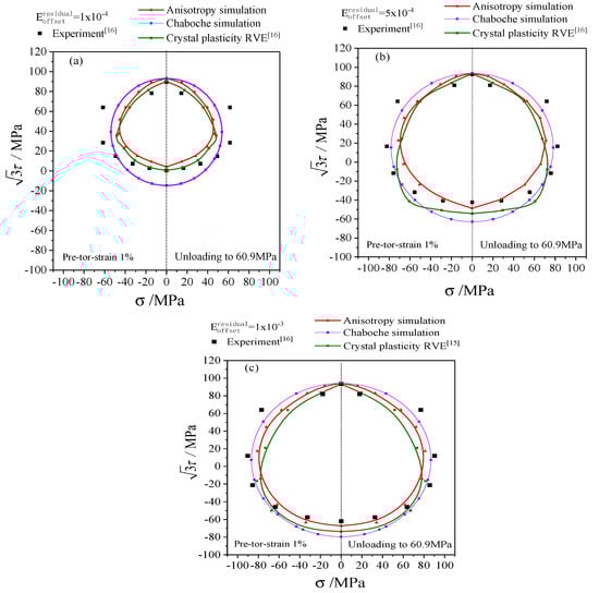 The simulations and experiments of subsequent yield surfaces on the stress plane with preloading of 1% proportional pretension equivalent strain and unloading to equivalent stress of 61.8 MPa: (a) the offset strain is 1 × 10−4; (b) the offset strain is 5 × 10−4; (c) the offset strain is 1 × 10−3.