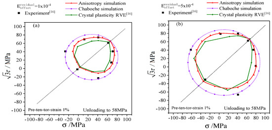 The anisotropic distortional yield surface expanded continuously with the increase of offset strain, which was consistent with the experimental data and the simulation results of the crystal plastic model. The cross effect of the anisotropic yield surface was relatively prominent with the offset strain of 1 × 10−4. The “sharp point” appeared in the preloading direction, and the yield surface was flat in the opposite direction. The cross effect of the distortional yield surface was gradually weakened when the offset strain increased from 1 × 10−4 to 5 × 10−4 and eventually reached 1 × 10−3, and the anisotropic distortional yield surface was gradually approaching the isotropic circular yield surface computed by the Chaboche model (cf. the purple solid lines in Figure 11, Figure 12 and Figure 13), which complied with the experimental data.
