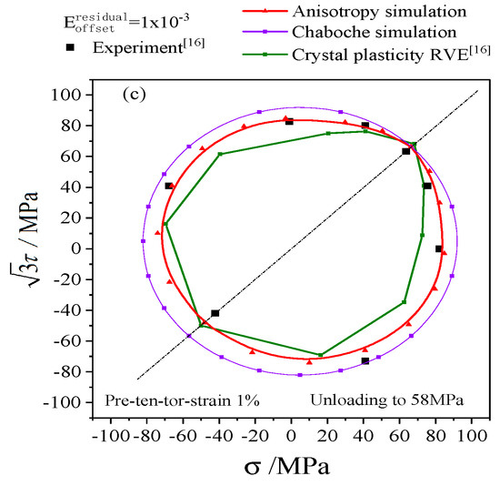 The parameters of kinematic hardening and isotropic hardening parts of anisotropic yield model in Table 1 are the same as those in Chaboche model. The diameter of the anisotropic distortional yield surface (cf. the red solid lines in Figure 11, Figure 12 and Figure 13) was smaller than that of the circular yield surface simulated by Chaboche model under small offset strains, and the ratio of the two diameters along the loading direction was , as shown in Figure 11, Figure 12 and Figure 13. Therefore, the subsequent yield surface derived from the Chaboche model was the same as the subsequent yield surface simulated by the anisotropic yield model when anisotropy gradually degenerated to isotropy. The diameter of the circular yield surface simulated by Chaboche model could be reduced to fit the experimental curve by adjusting the parameters of the model, and the simulation results were obviously better than the curves with the parameters adopted in this paper. However, the non-circular characteristic of the experimental yield surface could not be well captured by Chaboche model.