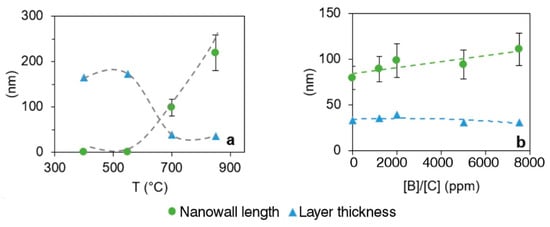 (a) Nanowall length and layer thickness for B-CNW growth at 400 °C, 550 °C, 700 °C, and 850 °C at a 2000 ppm [B]/[C] ratio; (b) nanowall length and layer thickness for B-CNW growth at 0, 1200, 2000, 5000, and 7500 ppm [B]/[C] at 700 °C.