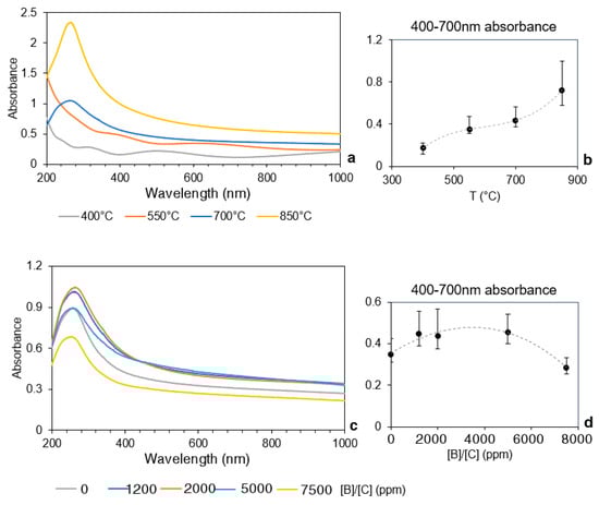 (a) UV-visible absorbance spectrum and (b) 400–700 nm average absorbance for B-CNW growth at 400 °C, 550 °C, 700 °C, and 850 °C at 2000 ppm [B]/[C] ratio; (c) UV-visible absorbance spectrum and (d) 400–700 nm average absorbance for B-CNWs at 0, 1200, 2000, 5000, and 7500 ppm [B]/[C] at 700 °C.