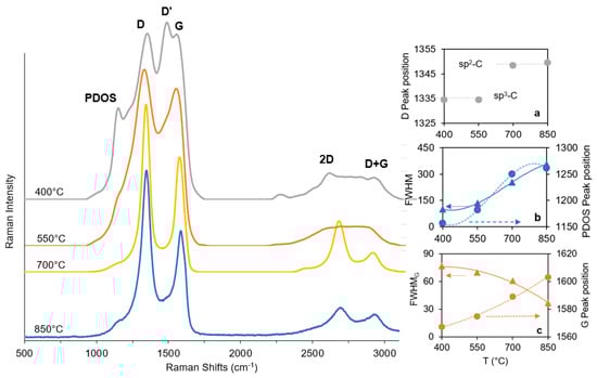 The G band centered at 1580 cm−1 is associated with bond stretching of sp2 atoms in rings and chains (G band, Figure 5b). The G peak position is shifted to a higher frequency with higher temperatures and the full-width at half-maximum (G-FWHW) is also found to decrease with temperature. Marchon et al. have reported a similar trend and have linked it to a decrease in sp3 content [].