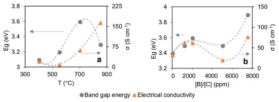 In Figure 6a it is possible to observe how higher electrical conductivity belongs to sample growth at a higher temperature, in a similar fashion to nanowall length, as this parameter particularly affects charge mobility. Longer wall structure delivers higher conductivity, mostly due to the minimized effect of carrier scattering at the inter-wall regions and surface defects. Next, the optical bandgap shows a maximum for the sample growth at 700 °C, which is much larger than the values reported by Kawai et al. []. This effect is unrevealed, though it could be attributed to the specific molecular structure caused by boron doping. Boron incorporation into the carbon lattice slightly positively affects nanowall length, which is not directly translated into an enhancement of the electrical conductivity; however, the latter, jointly with the optical bandgap, depends on the [B]/[C] ratio (Figure 6b). Overall, the incorporation of boron into the CNW lattice structure induces the unique effect of enhanced electrochemical performance and improved charge transfer [,].