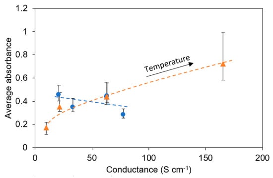 The dependency of B-CNW average absorbance in the 400–700 nm range, as a function of the conductance, is reported in Figure 7. It is interesting to observe how the conductance and absorbance are slightly negatively correlated for different boron concentrations (blue ●), while they are positively correlated for different growth temperatures (orange △).