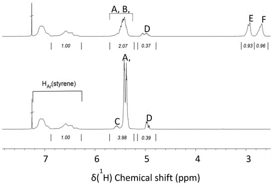 Figure 3 depicts a region of the 1H-NMR spectra of Kraton (bottom) and partially epoxidized Kraton (top). The signals in the 7.2–6.2 ppm region result from the aromatic ring of the styrene units. They remain unchanged in the epoxidation reaction and their intensity can be used as internal intensity reference to compare the spectrum of a non-epoxidized and epoxidized sample. The signals of the olefinic protons of the butadiene segments appear in the 5.8–4.8 ppm region. The copolymerization with butadiene can result in cis-and trans-1,4-butadiene units, respectively, and in vinylic 1,2-butadiene units. The 1H chemical shifts of the corresponding protons are summarized in Table 1.