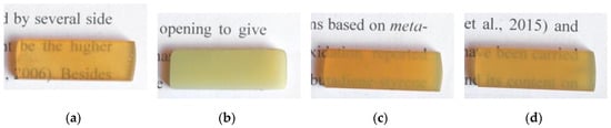 Photographs showing the different levels of optical transparency of EP/eKraton blends containing 10 wt.% of eKraton of different irradiation doses in the visible light range (400–700 nm). (a) Pure epoxy (EP); (b) eKraton; (c) eKraton-20; (d) eKraton-50 (the width of the sample is 10 mm in each case).