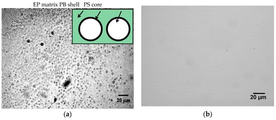 The epoxidized butadiene segments were miscible with the epoxy resin, whereas polystyrene parts as well as non-epoxidized parts were immiscible. The non-epoxidized butadiene (PB) parts formed the shell, and polystyrene (PS) parts may formed the core of the domain, as shown in the schematic enlargement presented in the inset of Figure 5a. However, the microstructure of eKraton/EP after curing was not observed (Figure 5b), because the majority of the microdomains of polystyrene were converted into nanodomains, and the nanostructure cannot be observed by optical imaging.