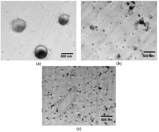 For detail analysis of the size and distribution of the domain in the nanoscale range, TEM analysis were carried out. The EP/Kraton blend morphology with 10 wt.% of unmodified block copolymer is presented in Figure 6a, whereby the morphology of the EP/eKraton blend treated by a different dose is shown in Figure 6b,c. At first glance, heterogeneous morphology was seen in all cases. It is noted that the EP/eKraton blend, which was not cured by EB irradiation, consisting of a bright spherical domain in the 0.5–1 µm range, dispersed in the continuous epoxy matrix, as indicated in light gray. Owing to the electron density difference of different groups and the diversity in the preference of RuO4 staining, the continuous areas can be ascribed to the cross-linked epoxy matrix, and the spherical cores as indicated in dark represent the polystyrene parts along with block of non-modified rubbery polybutadiene. The lamellar morphology was also observed inside the spherical core, where light areas correspond to the styrene block, whereas the thin dark shells surrounding the spherical cores can be assigned to the non-epoxidized PB segment.
