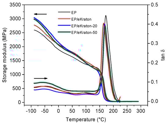 Figure 7 shows the temperature dependencies of the dynamic mechanical properties (storage modulus (G′) and damping coefficient (tan δ)) of the pure epoxy thermoset and EP/eKraton blends with different doses. In general, the addition of modified block copolymers (eKraton) diminishes the storage modulus of epoxy resin due to the presence of a soft rubbery phase at high temperatures (T). Here, the storage modulus for EP/eKraton treated by EB increases for T < 100 °C and decreases for T > 100 °C. The values obtained from DMA are listed in Table 2. The unmodified epoxy has a main glass (α) transition temperature Tg = 173 °C and a secondary (β transition) temperature of −40 °C [,].