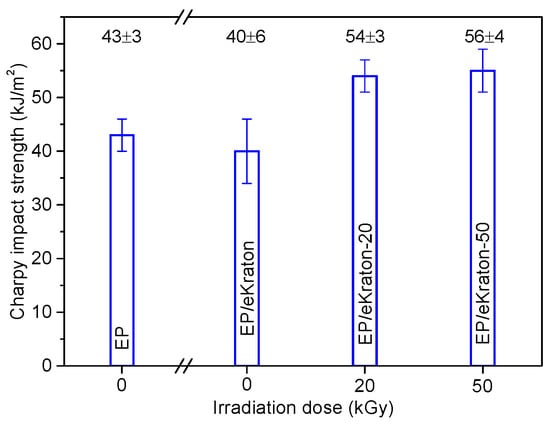 The Charpy impact strengths of EP/eKraton blends modified with different irradiation doses compared with neat epoxy thermoset.