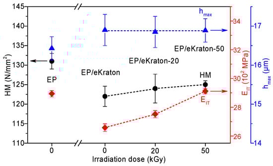 Hardness (HM), indentation modulus (EIT), and maximum indentation depth (hmax) of EP/eKraton blends modified with different irradiation doses compared with the neat epoxy thermoset.