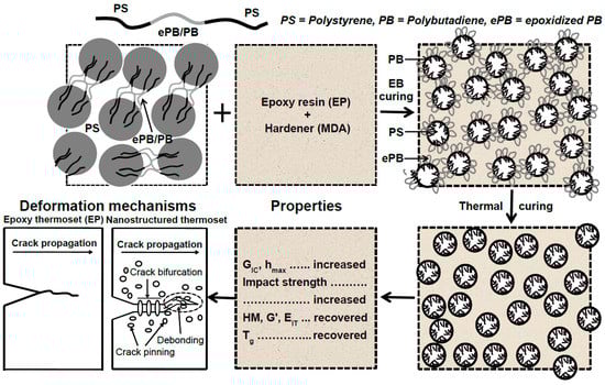 A schematic illustration of the formation of micro/nanodomains in the EP/eKraton blends. The ePB segments of eKraton are miscible with the epoxy system, and the PB and PS segments are immiscible with the DGEBA/MDA system. The micro- and nanostructured EP/eKraton blends are fixed by dual curing, the modulus and stiffness are recovered fractured toughness, impact strength increases, and Tg values decrease. The deformation mechanism follows the crack pinning, crack bifurcation, and debonding processes.