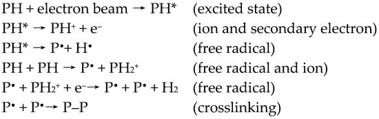 The EB irradiation can be used to produce micro- and nanostructure systems []. Accelerated electrons gradually lose their energy through a huge number of small energy transfers. Basically, the effect of EB irradiation depends on several parameters. These are the absorbed dose (D); the energy absorbed per unit of mass, measured in Gray (Gy)), dose rate (energy absorbed per unit of mass and unit time, measured in Gy/s) [], gas atmosphere, and the constitution of the polymer to be irradiated. The interaction of EB with the polymer causes the formation of excited states or ions and secondary electrons (Scheme 1). These reactive species are converted into free radicals, leading to chain scission, molecular degradation, chain branching, and cross-linking []. The ratio of crosslinking to scission reaction depends on the constitution of polymers, as well as the EB treatment conditions. The outlines of the reaction mechanisms are shown in Scheme 1 [].