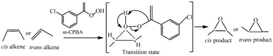 The oxygen-oxygen bond in m-CPBA is quite weak (about 33 kcal/mol) which leads to the highly reactive nature. One of the prime impacts of this convention is that the stereochemistry is always retained. That means, a cis-alkene always gives the cis-epoxide, and a trans-alkene gives a trans-epoxide product. This is a prime example of a stereoselective reaction in organic chemistry. During the reaction, a very reactive transition state is formed, where the bond between the oxygen and the alkene is being formed at the same time that the O–O bond is breaking, and the proton is being transferred from the OH to the carbonyl oxygen. Those little-dotted lines represent partial bonds. The mechanism of m-CPBA/BCPs system is shown in Scheme 2.