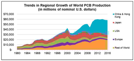 Trends in regional growth of world PCB (printed circuit boards) production (1980–2016). Reprinted with permission from []; Copyright 2016 IPC.