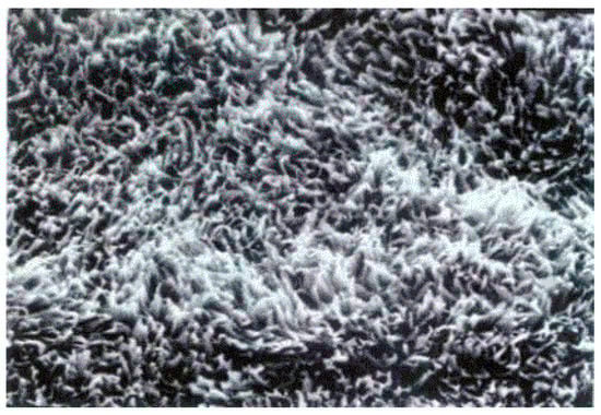 Scanning electron microscopy (SEM) image of a 10k× fold magnification black oxide treated surface. Reprinted with permission from []; Copyright 2002 Atotech GmbH.