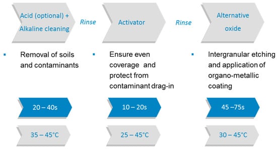 The oxide replacement technologies were developed in the mid to late 1990s due to high energy consumption, weak reliability in acid environment and the vertical processing conditions of the black oxide process []. Nowadays, they are widely seen as the “standard” adhesion promoting processes and are marketed under different trade names (Top bond promoter 7878-JKEM, Oxidestar–Wisecompany, CZ-2030–Uvemura, Bondfilm–Atotech, etc.). Although it is not possible to achieve peel strengths equal to the black oxide process, the overall advantages, such as thermal reliability, excellent protection against pink ring and wedge voids, stable surface profile, optimized chemical resistance, sufficient inner layer adhesion, high capacity horizontal processing, short treatment time, simple chemical control, etc., ensured the process changeover to alternative oxide processes in multilayer board production [,]. Unlike their predecessor, the surface roughness is not achieved by growing copper crystals on the surface of the circuit, however by etching down into the copper. Thus, a very dense microstructure is provided by a modified sulfuric/peroxide etchant (intergranular etch) to ensure mechanical bonding between the copper and the polymeric material. Mechanical adhesion is still predominant. In addition, an organo-metallic coating is also formed by reaction with cyclic amine compounds (e.g., benzotriazole derivatives) which gives some level of chemical adhesion between the treated copper and the applied dielectric material (e.g., epoxy resin) [,]. Figure 3 shows a general overview of the entire oxide replacement process.