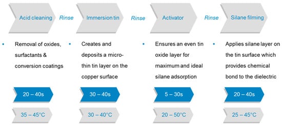 Although the oxide replacement technologies are seen as the standard processes for PCB manufacturing, the earliest alternative oxide techniques were based on non-etching adhesion promoters and are commonly known as “white oxide”. The name is derived from the use of metals being deposited on the copper surfaces in order to facilitate adhesion to organic molecules by decreasing the isoelectric point (IEP) of the surface [,]. Typically, these metal conversion layers consist of a thin tin layer (<0.1 µm) and the subsequent coating of an organosilane which further reacts with the prepreg systems. The process steps of the white oxide process are shown in Figure 7.