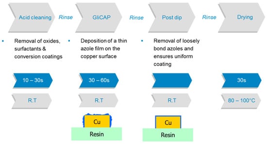 A new route to follow is based on a particular azole derivative acting as an interfacial adhesion promoter. The attachment to the copper surface is possible because of the azole group, whereas a functional group, specifically silanol groups, interact with the epoxy resin (“Glicap technology” by Shikoku company) []. The idea behind this technology is not new. Many researchers focused on copper modification with silanes [,], phosphonates [,], thiols [,], imidazoles, azoles [,], azole derivatives [,], etc., however none of the bonds were sufficiently thermally stable (e.g., Cu-S, Cu-Si, Cu-P) nor was an up-scaling of the treatment possible. Here, the reinstatement value of the process is attributed to the synthesis of specific azole silane derivatives at a larger scale and its economic feasibility. A uniform thin organic film (approximately 10 nm) without pre-treatment of the copper surface (e.g. with tin) is deposited, resulting in excellent adhesion to the insulating materials for innerlayers without roughening the copper surface and the compatibility with various prepreg materials, and is also non-epoxy based with high glass transition temperature Tg. The coating procedure is shown in Figure 8: