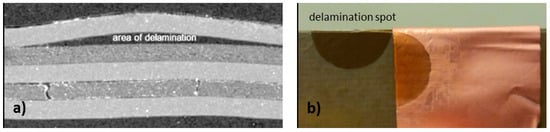 The term “interphase” was coined by Sharpe and describes the transition zone when dissimilar materials are brought into contact []. Many researchers have investigated the interfacial regions between metal substrates and various polymers. Because of the requirements for strong adhesion in PCBs and other electronic applications (e.g., integrated circuits substrates), investigations on adhesion and failure modes of copper/polymer interfaces are mandatory. The strength of the bond after lamination usually predicts the performance in reliability tests and the long-term stability. An initially weak interface leads to delamination failures (Figure 9).