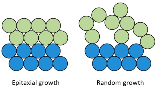 The growth of cuprous oxide is known by a specific epitaxial relationship at the beginning of oxidation, while random growth is favored for CuO with a highly asymmetric monoclinic crystal structure (Figure 10) []. The Cu2O/CuO interface with no epitaxial relationship generates internal stresses due to its different lattice structure and is much weaker than the Cu/Cu2O interface. The inherent brittleness and density difference between Cu2O and CuO is responsible for the weak interfacial adhesion with polymer resins []. At the initial stage of oxidation, the formation of an oxide layer increases the peel strength (<20 nm). Cho et al. reported that growth of oxide grains (originating either from Cu2O or CuO) changes the roughness of the surface so that epoxy resins undergo mechanical interlocking, which in return leads to higher peel values []. In accordance with thiss, an enhancement of button shear strength to epoxy was observed because of thin Cu2O/CuO formation during hygrothermal ageing on bare Cu [,]. The strongest interfacial adhesion with polymeric resins is achieved with oxide thickness between 20 and 30 nm, while further oxidation causes deleterious influence on the copper/polymer adhesion with significant reduction in peel strength [,]. The weak boundary of the Cu2O/CuO interface is responsible for adhesion failure when the oxide thickness exceeds 50 nm. The oxidation of copper metal at elevated temperatures is also occurring under the protection of coated films and decreases the adhesion strength [].