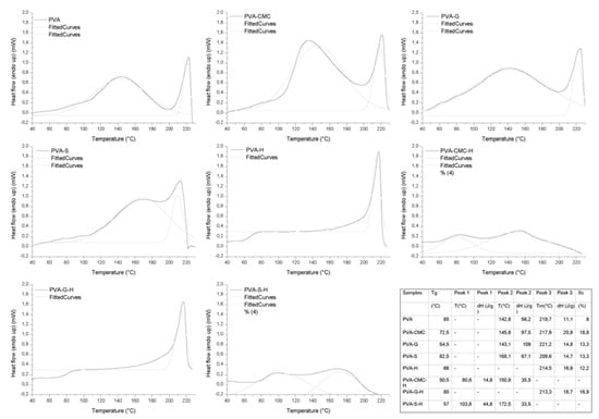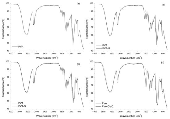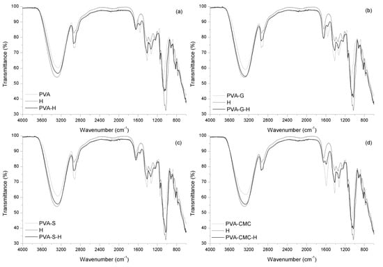 In summary, in all samples, the presence of all the intended components was observed. In addition, the PVA-G sample exhibited esterification of gelatin’s carboxylic groups; in the PVA-S analysis, physical interaction was observed between polymers; PVA-CMC samples exhibited hydrogen bonding between polymers; PVA-G-H samples presented physical and probably chemical interactions between components, while PVA-S-H and PVA-CMC-H exhibited only physical interaction between materials.
