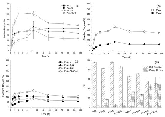 Sample swelling degree (a–c); sample degradation and gel fraction (d).