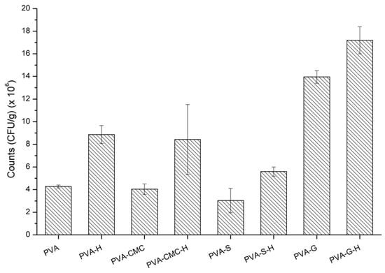 Starch is a hydrophilic natural polysaccharide and does not form stable hydrogels by itself. Starch was mixed with PVA and hydrogels were chemically formed (by adding glutaraldehyde) and loaded with turmeric. The resulting gels were bactericidal (active against Gram-positive and Gram-negative organisms) [36]. PVA–starch hydrogels and boron complexes were cross-linked with and without glutaraldehyde, where the samples chemically cross-linked presented antibacterial and antifungal activities [37]. Electrospun PVA–chitosan–starch nanofibrous mats for wound dressings presented adequate mechanical properties and porosity to absorb aqueous fluids. They also presented antimicrobial properties against Gram-positive and Gram-negative bacteria [38].