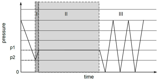 For the process shown in Figure 1, the reaction chamber was evacuated to the base pressure p2. The participating oxygen content results from remaining air that is defined by p2. Therefore, the remaining oxygen in the air corresponded to the amount of oxygen, which was used for oxy-fluorination. Then, the F2/N2 mixture was added to achieve pressure p1, which was the maintaining pressure over the reaction time. The resulting concentrations of oxygen and fluorine are shown in Table 1. The inward flow of F2/N2 defined the amount of fluorine used for the reaction (Figure 1I). After completion of the process (Figure 1II), the reaction chamber was evacuated and purged with air several times to completely remove fluorine (Figure 1III). Leftover reaction gas was removed by a CaCO3 absorber.