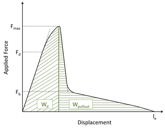 Schematic force-displacement curve recorded during a pull-out test revealing the characteristic points for the calculation of interfacial parameters.