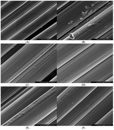 Oxy-fluorination and fluorination lead to changes in surface morphology, as shown in Figure 3. As can be seen in Figure 3B–F, by increasing the fluorine content in the reaction chamber, the striation that is caused by the stretching of fibers appeared to be more pronounced. This is associated with a roughening of the fibrillary surface structure, which can be considered as result of the oxidation of PAN-based carbon fibers [42]. Here, all modified fibers had porous areas along their axis and exhibited particle contaminations on their surfaces. Figure 3E,F indicated the presence of a porous near-surface layer covering the entire fiber. These findings correspond to previous studies [32]. Comparing the modified fibers to the untreated fiber sample (Figure 3A), the desizing of fibers was observed. During their treatment with high concentration of fluorine in the process gas (10 vol% fluorine), the fibers were completely desized (Figure 3F).