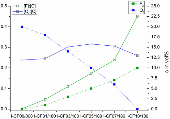 Relative amounts of oxygen ([O]:[C]) and fluorine ([F]:[C]) in dependence on the fluorine content in the process gas used to modify carbon fiber samples.