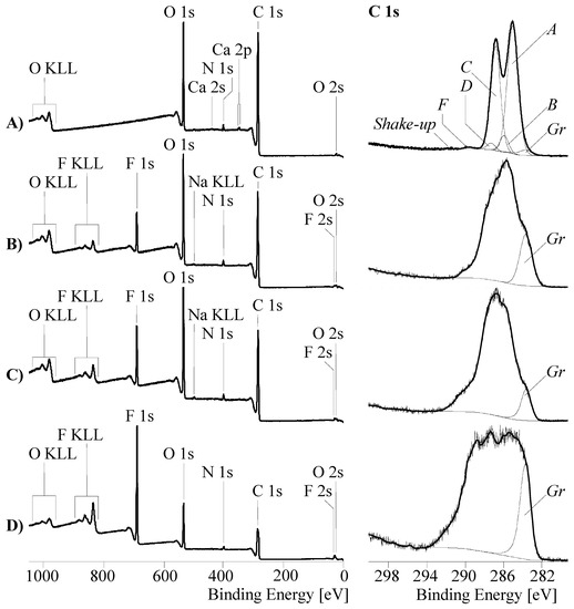 The spectrum was deconvoluted into six component peaks showing the different binding states of the carbon atoms (Figure 7). The main component peaks A at 285.00 eV as a result from saturated hydrocarbons [44]. The second intense component peak C at 286.67 eV shows the presence of C–O ether and alcohol groups, which were formed by opening the oxirane groups during the curing of the epoxide. The C–O bonds were also constituents of the urethane groups in the polyurethane film former. A minor amount of intact oxirane rings was detected as component peak D at 287.34 eV. The appearance of the component peaks B (at 285.77 eV) and F (at 289.5 eV) is based on the presence of the polyurethane film former in the coating layer. Photoelectrons of the amine-sited carbon atoms in the urethane groups contributed to component peak B, and the photoelectrons of the corresponding carbonyl carbon atoms contributed to component peak F. Since the intensity of component peak F was less than the intensity of component peak B, C–N bonds of preferably secondary and tertiary amino groups must be present in the coating network. In order to fit the sum curve of all component peaks to the recorded spectrum, it was necessary to introduce a further component peak Gr at 283.62 eV [25]. This component peak resulted from carbon atoms in the sp2 hybrid state forming the graphite-like lattice of the carbon fibers. Electron transitions between occupied π and unoccupied π* orbitals (π → π*) led to shake-up peaks, which were observed at 291.45 eV. The oxidation reactions during the oxy-fluorination process were characterized by the production of oxygen- and fluorine-carrying functional groups (Figure 6). A variety of these groups remain covalently bonded on the carbon fiber surfaces. Due to the newly formed functional groups, the shape of the C 1s spectra changed significantly (Figure 7B–D) [43]. By increasing the amount of fluorine in the gas mixture (which correlated with the degree of surface functionalization), they became wider. Similar spectra were recorded by Sherwood et al. [45] for highly oxidized carbon fibers. The reason for the apparent widening of the C 1s spectra was an increase in the number and intensities of the component peaks resulting from the different functional groups. In fact, it was not possible to unambiguously decompose the C 1s spectra into their component peaks and assign the chemical environment of carbon to each of the individual component peaks. However, based on the changed shape of C 1s spectra, it was concluded that the chemical structure of the sizing network that originally wrapped the carbon fiber was destroyed during the oxy-fluorination (the carbon fibers were desized, which can also be seen in Figure 3).