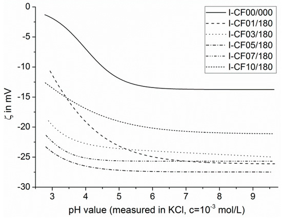 Since the XPS method provided little insight into the nature and reactivity of the chemically active surface groups, electrokinetic measurements were performed. Figure 8 shows the electrokinetic potential (zeta-potential, ζ) in dependence on the pH value of a 1 × 10−3 mol·L−1 aqueous KCl solution. During variation of the pH value, the potassium and chlorine ions kept the ionic strength of the aqueous solution nearly constant. XPS studies showed that the surfaces of the sized carbon fibers (I-CF00/000) were not endowed with numerous surface groups able to undergo dissociation reactions in aqueous media. Nevertheless, the shape of the ζ = ζ(pH) curve recorded from sample I-CF00/000 was characteristic for hydrophilic solids. Obviously, negatively charged OH− ions that were specifically adsorbed on the fiber surface led to negative surface potential values, which were observed as negative zeta potential values. Based on an increase in pH, the availability of OH− ions driving the adsorption grows as well. Hence, the zeta potential increased with pH to a maximum value of about 12 mV at pH > 6 (Figure 8). The observed zeta potential maximum corresponded with a constant number of charge carriers on the fiber surface. Thus, at pH > 6 all surface sites were occupied by OH− ions. Due to the hydrophilic surface character of the sized carbon fibers, the OH− ions were not forced to strip off their hydration shells to make space for the adsorption of further OH− ions. Since ether groups were not suitable to be protonated in medium acidic environment, positive zeta potential values were not observed. However, in the acidic range (3 ≤ pH < 4.5), the ζ = ζ(pH) curve seemed to be s-shaped (Figure 8), indicating that a few positively charged amino groups (–N+R2H) partly compensated the negative surface potential, which was caused by the adsorption of OH− ions.