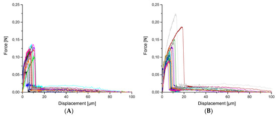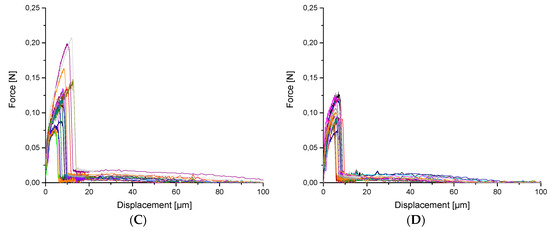 Force-displacement curves for I-CF00/000 (reference) (A), oxy-fluorinated samples with 1 vol% F2 (I-CF01/180) (B), and 5 vol% F2 (I-CF05/180) (C) as well as a fluorinated CF (I-CF10/180) (D).