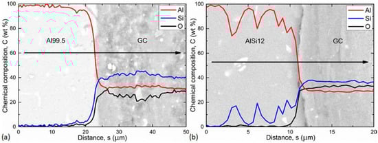 Line EDS element profiles of (a) Al99.5-based and (b) AlSi12-based MMSFs.