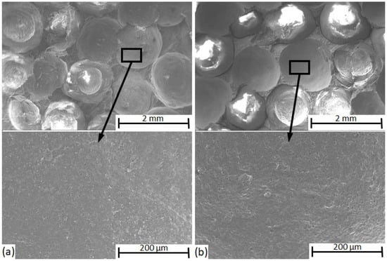 In both subfigures, the smooth surface of the craters from which the ceramic hollow spheres were removed during the crack propagation and fracture can be clearly observed. The ratio of the adhesive bonding force within the whole bonding force between the constituents can be considered low; however, this is indirect evidence. The actual bonding force is hard to measure directly, but the qualitative investigation detailed above will be a good background for the investigation of the fracture surfaces (in Section 3.2) and will be beneficial to understand the crack propagation in the MMSFs.