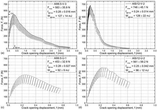 Typical force–crack opening displacement curves of (a) Al99.5-V, (b) AlSi12-V, (c) Al99.5-U, and (d) AlSi12-U MMSFs.