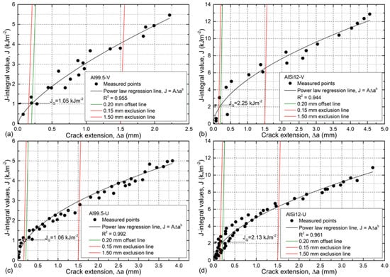 J–R curves of (a) Al99.5-V, (b) AlSi12-V, (c) Al99.5-U, and (d) AlSi12-U type MMSFs.