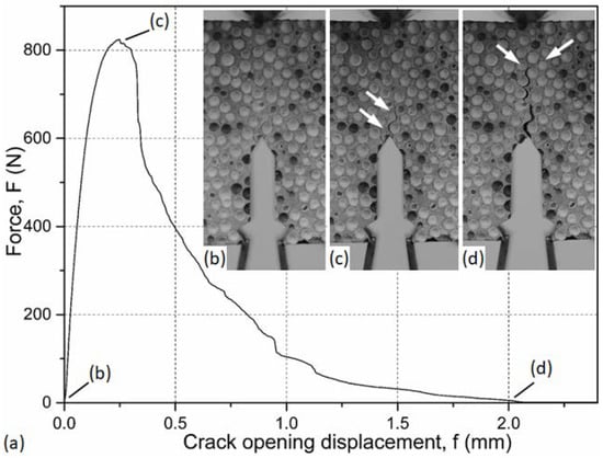 First, the fracture process during the loading of the samples was observed. Figure 7 shows the force–crack opening diagram for the AlSi12-V-1 sample and the corresponding pictures taken from the surfaces of the sample, showing the crack propagation and crack surface after the test. Starting from zero load, the specimen was unharmed and ready for the test (Figure 7b). As the increasing load reached its maximum a crack initialized in the notch tip (Figure 7c), the crack path ran along the interfaces between the hollow spheres and the matrix material (arrows in Figure 7c,d). In the case of the AlSi12 matrix, due to its relative brittleness (compared to Al99.5) normally an uncertainty appeared in the recorded load diagram (small amplitude waves just after the peak). As the crack propagated, the load gradually decreased (Figure 7a). In a point in the load–crack opening diagram, a sudden drop appeared and the crack branched into subcracks, as can be observed in Figure 7d, shown by the arrows. Finally, the sample broke into two parts.