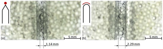 As is mentioned in Section 3.1, the different notch geometries allowed different crack initializations, which is the reason behind the unexpectedly lower fracture energies in the case of blunter notches. The surface for the crack initialization is larger in the case of blunter U notches, since the stress concentration is lower and a similar stress distribution can be found on the perimeter of the notch tip, as is sketched in red at the top-left corners of the subfigures in Figure 8, representing the macrographs of the notch tips from the direction of the notch (referring to Figure 1, the viewpoint is from below).