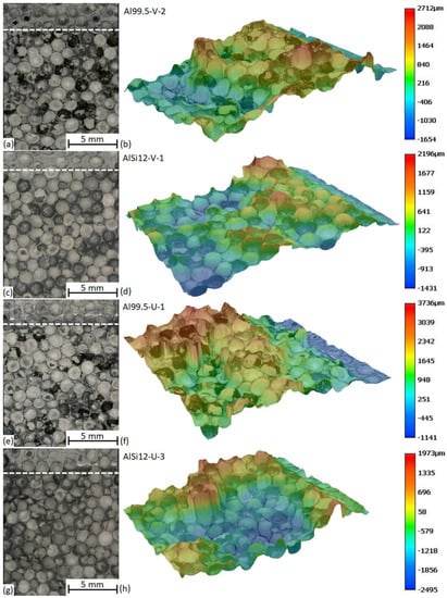 In the case of the Al99.5 matrix, the ratio of the broken spheres to the number of all spheres in the fracture surface was about 55–60%, while this ratio was ~15% in the case of the AlSi12 matrix, proving weaker bonding. However, the distance required for the crack to propagate was longer in the case of the AlSi12 matrix, resulting in a higher JIC value and a more quickly increasing R-curve, as is plotted in Figure 6. The 3D images show some deviation from the middle plane of the sample, but the deviation remained within ±2 mm at maximum, and the extreme values were typically far from the crack initialization site.